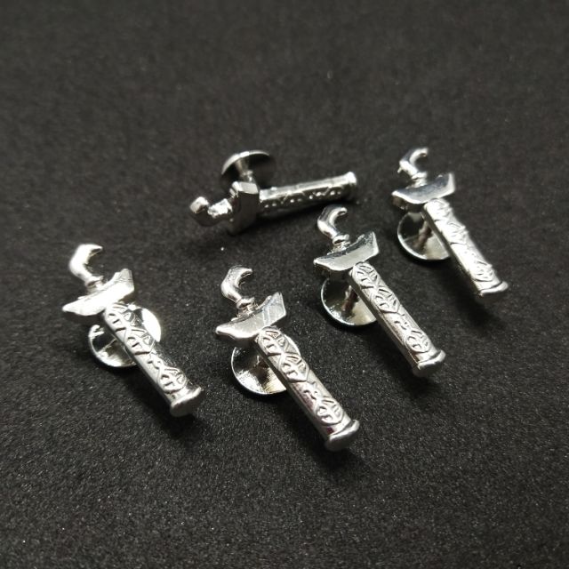 A set of 5 pieces of Baju Melayu buttons studs in a miniaturised classic keris Malay dagger shape with a highly decorative hilt in a plain sheath rhodium plated in bright chrome-silver. This is a Body. Kos Penghantaran Set Butang Keris Baju Melayu Set Butang Keris Baju Melayu 1 set mengandungi 5 butir butang Ada 5 pilihan keris seperti dalam gambar.
